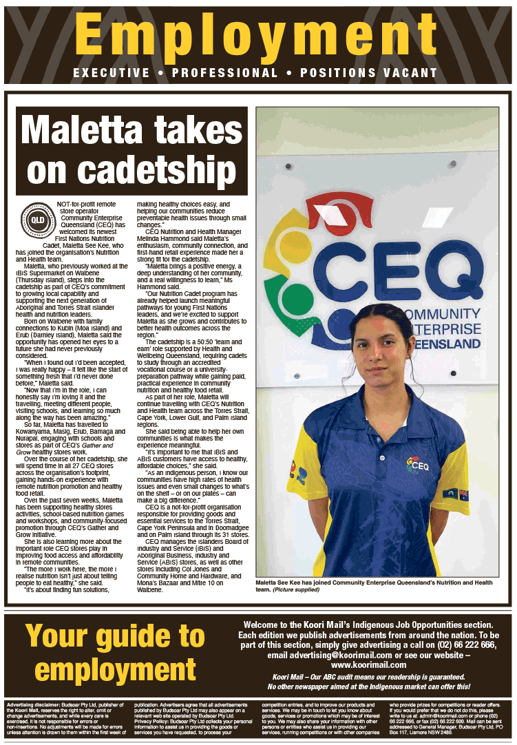 The Koori Mail’s job advertisement pages are read by Aboriginal and Torres Strait Islander people Australia-wide.