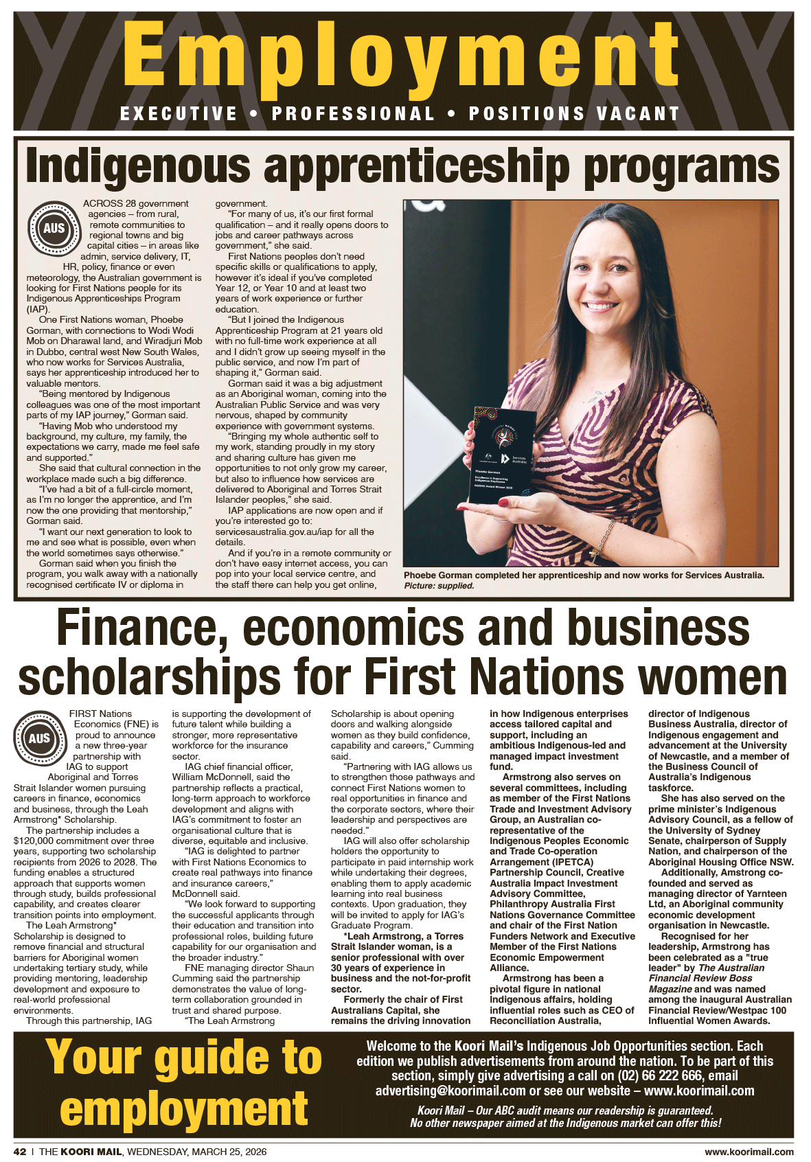 Use the links above to view/download the employment pages from recent editions. For our latest edition, buy a copy of the Koori Mail at your nearest major newsagency.